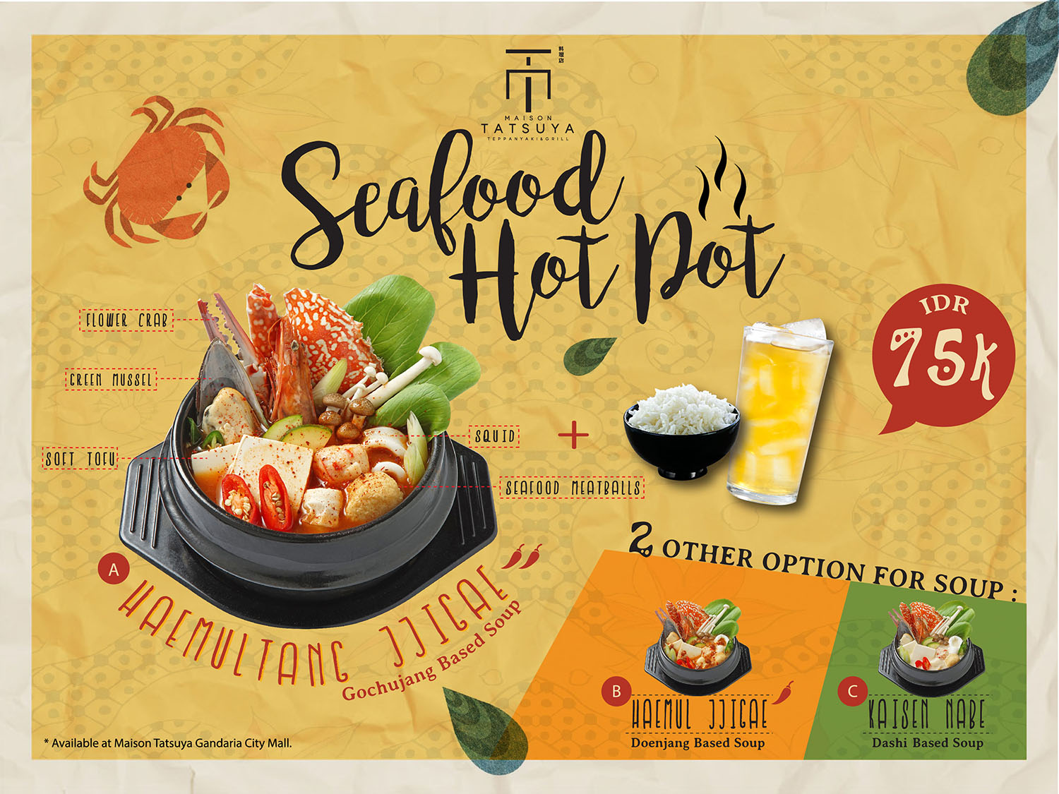 Tatsuya Menu Lunch : Lunch at La Strada, Italian restaurant at Shaw Centre ... : (served daily from open to 3pm).. (served daily from open to 3pm). Jumbo lump crab cake lunch plate. All lunch come's with a house complimentary of the day. It is indeed pricey but the lunch set menu is definitely a good deal. Miso soup & choice of crab calif, sp.tuna, eel avocado cucumber, or veggie roll.